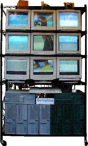 Galugtica has been constructed by the University of Kentucky Linux Users Group (UKLUG) as a demonstration and development cluster. Made of old PCs obtained from UK surplus for free (not unlike the Stone Soupercomputer), it is not very powerful... but it is a complete cluster configured with ethernet, PAPERS custom aggregate function network hardware, and even an array of monitors. Although there are over 30 machines dedicated to Galugtica, it is currently configured as a 9-PC computational video wall: