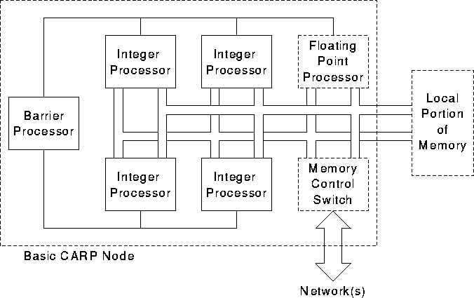A typical CARP Machine would have consisted of 64 CARP nodes with each CARP node having one floating-point processor, four 32-bit integer units, a fine-grain hardware synchronization mechanism and the interconnection network interface. The block diagram of a CARP node is given in Figure [CARPnode]