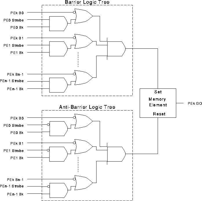 The static barrier mechanism presented in the thesis is the simplest of the barrier mechanisms, while the dynamic barrier mechanism is the most complex. The common element between the various barrier schemes is that they all use centralized barrier control logic, termed the barrier processor. The synchronization is not PE to PE, but rather PE to barrier processor. The barrier processor is responsible for tracking which processing elements participate in each barrier synchronization.