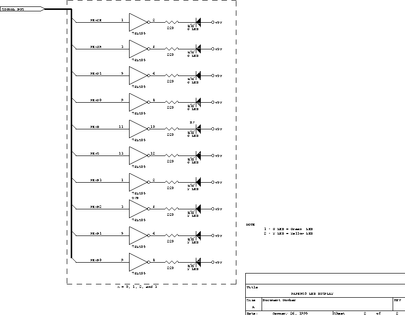 Inside the box, there is one 4" by 6" wire-wrapped card containing the PALs and LED driving circuitry and a 5 volt linear power supply (although a maximum of less than 1.5 amps is needed, we used a supply rated at 3 amps). Behind the circuit card on the back of the box are four panel-mounted Centronics connectors - so that the cables used to connect PEs to PAPERS0 are standard PC parallel printer cables. Ribbon cables connect the circuit board to the the centronics connectors. One end of each ribbon cable is crimped to the centronics connector while the other end is soldered to an 18 pin single-in-line (SIL) connecto on the circuit board.