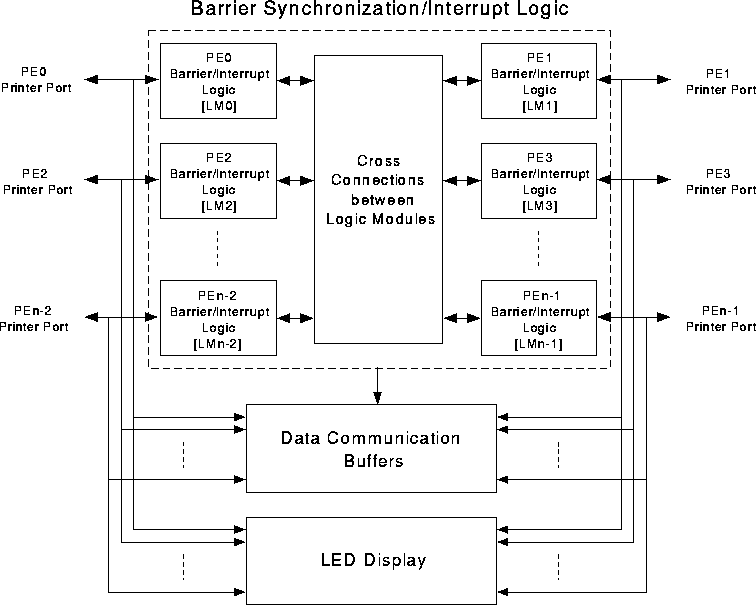 From our discussion, it is clear that dynamic barrier synchronization logic and interrupt logic are the main components of the PAPERS hardware. The run-time partitionable dynamic barrier scheme is implemented by replicating the logic tree of Figure [barrtree] at each PE (Node). Beside this, logic tree of either Figure [inttree1] or Figure [inttree2] implements the interrupt logic and is also replicated at each node. Therefore, PAPERS can be implemented by having an identical logic module for each PE.