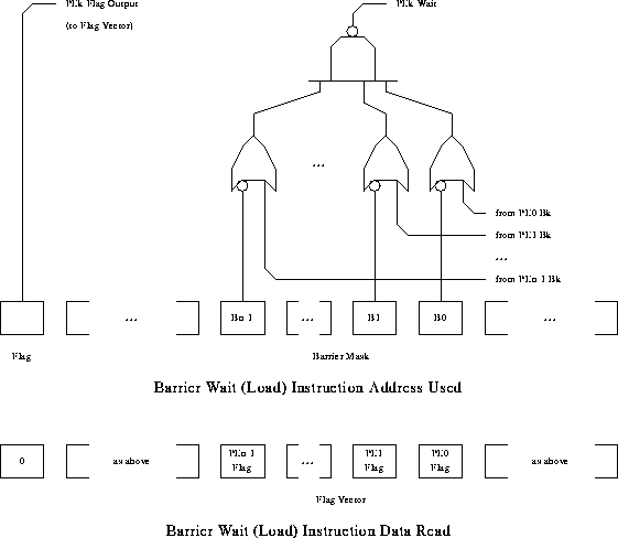 A PE invokes a barrier synchronization by making a read access to an address that is decoded as a barrier synchronization request; memory wait states are inserted to stall until synchronization has completed. Basically, the barrier hardware in the control units contains queues of both mask patterns and values to return. PASM's enable mask patterns are used to determine which processors participate in each barrier. The return values are typically ignored in conventional barrier synchronizations, but are the instruction sequence to broadcast in SIMD execution. If the barrier read is implemented by a LOAD operation, a barrier synchronization is performed; if the implementation is an instruction fetch, a barrier synchronization is performed and the next SIMD instruction is returned. Thus, changing between modes is simply a matter of MIMD mode executing a JUMP into barrier address space or of SIMD mode broadcasting a JUMP out of that space. Therefore, PASM prototype supports only static barrier synchronization.