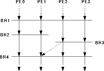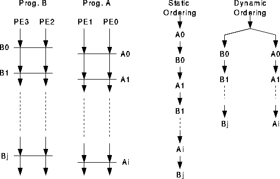 To illustrate the difference between static and dynamic barriers, consider the simultaneous execution of two different programs on a four processor machine such that program A is executed by processors 0 and 1, and program B is executed by processors 2 and 3. Since these two programs are independent, each may contain any number of internal barrier synchronizations, as shown in Figure [sbmdbmex].